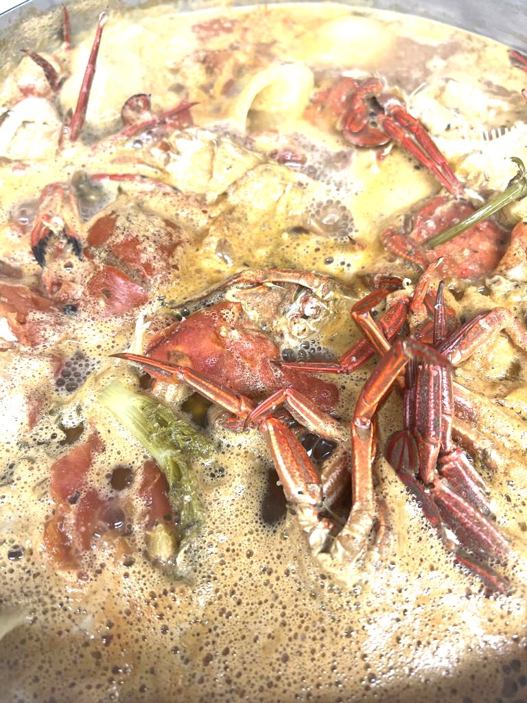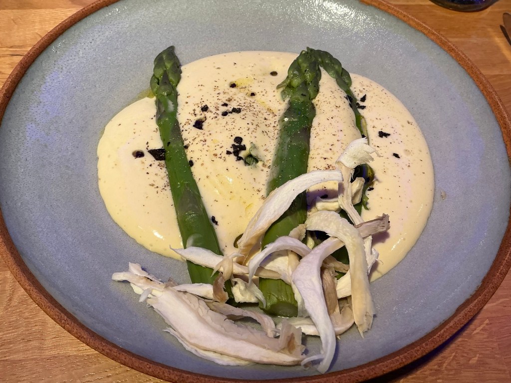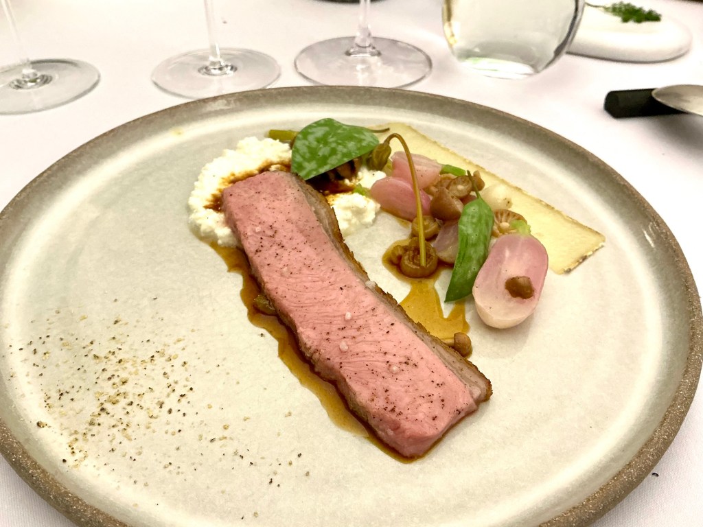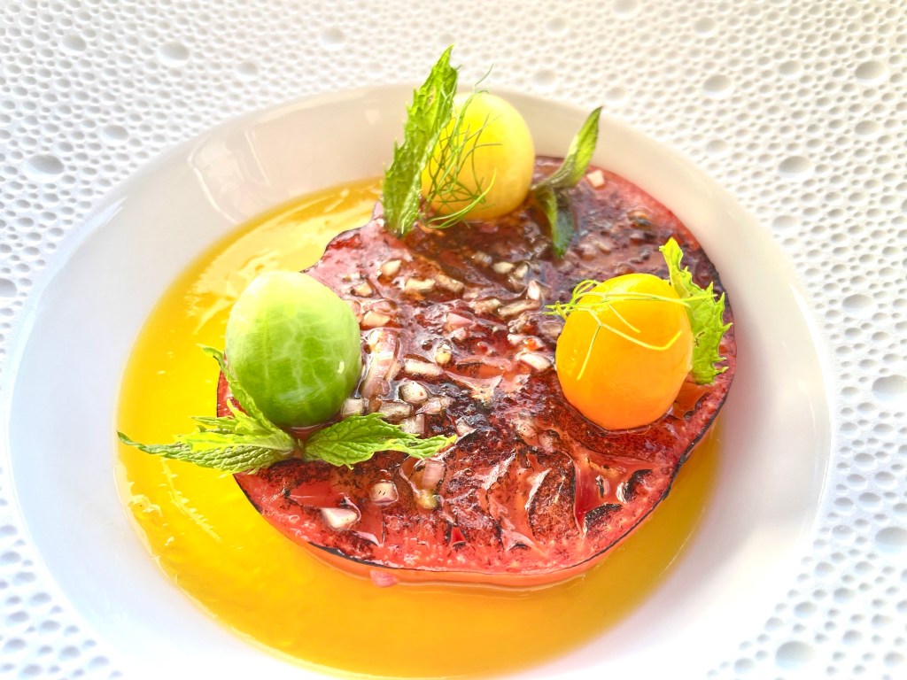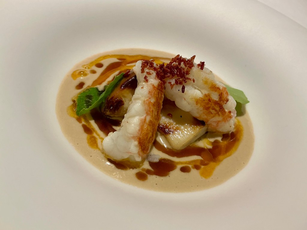 La queue de homard marquée à la grillade et les anisés du jardin, jus noir au vinaigre de fruit, jeunes poireaux.