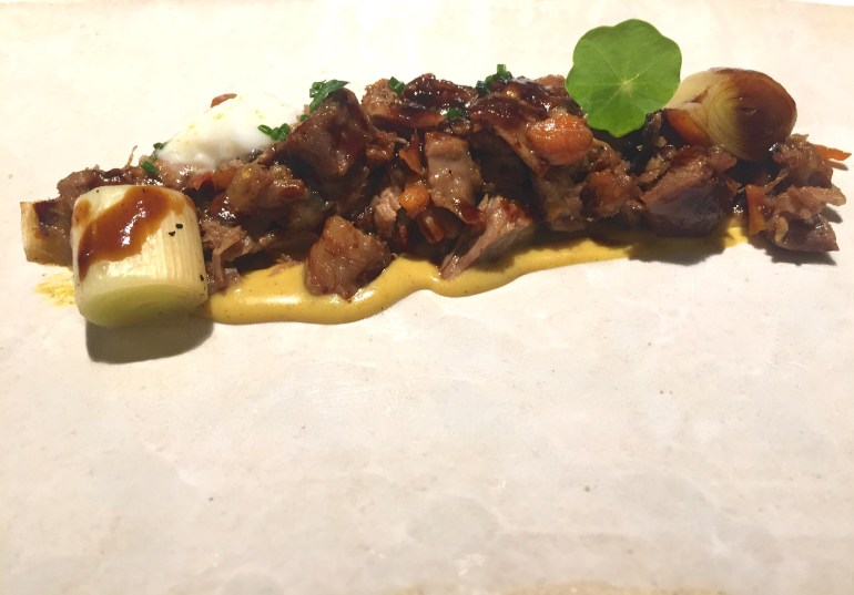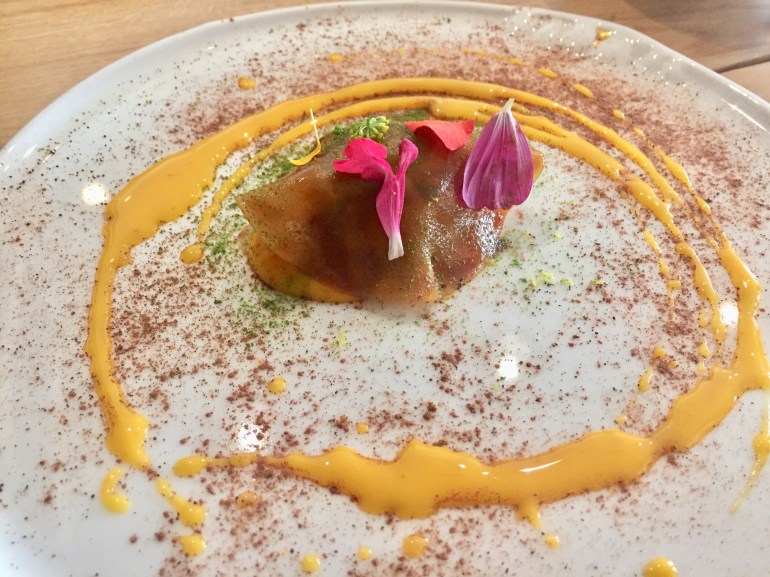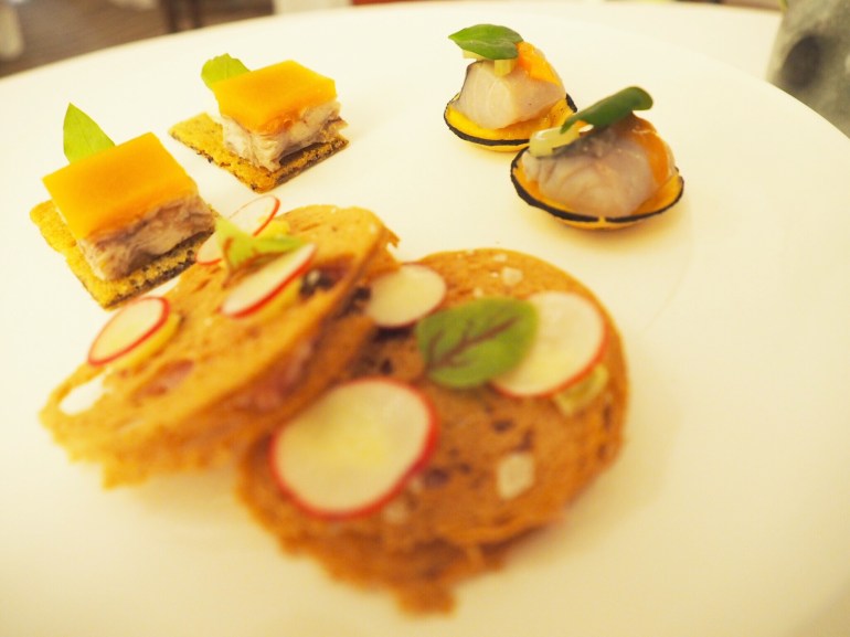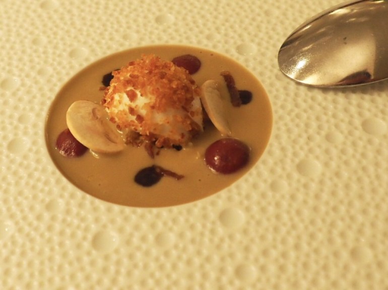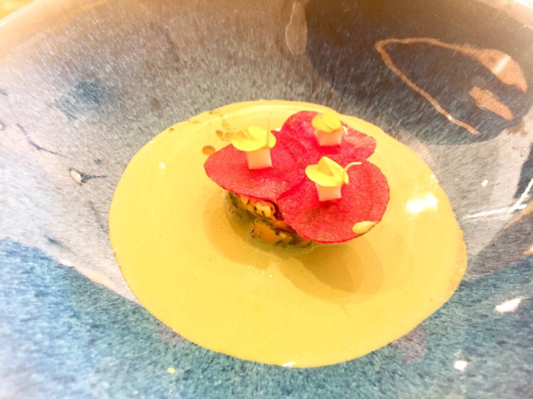 Les mises en bouche sont un subtil mélange du terroir et de créativité. Une mention pour cette belle crème anglaise au parfum de meurette, œuf de caille. C’est beau et délicieux et un clin d’œil à un plat emblématique de la Bourgogne.