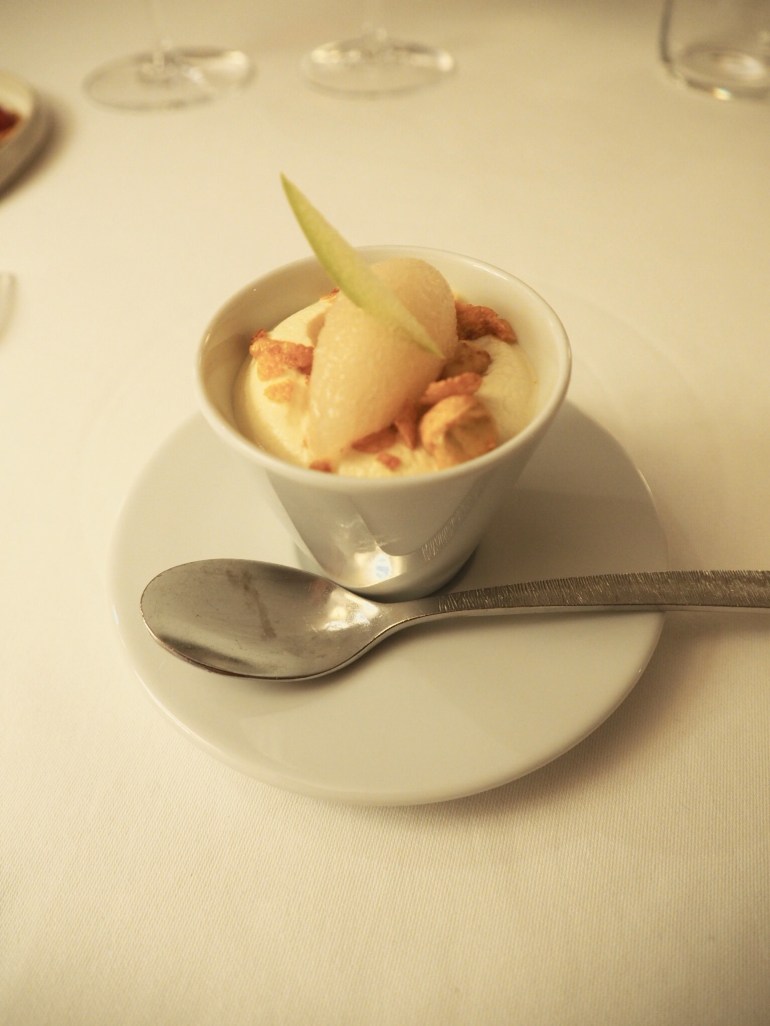Eric Pras qui est meilleur ouvrier de France et chef triplement étoilé propose une cuisine empreinte de tradition, de technique précise , et d’innovation. Ces dernières sont délicates et bien équilibrées. Eric Pras est venu écrire avec son associé Frédéric Lamy un nouveau chapitre de cette maison familiale. Il a su surtout garder l’âme des lieux et l’homme que nous avons rencontré est une belle personne cela se ressent en discutant avec lui. Natif de Roanne région des Troisgros ou autre Poularde d’Eteocle, l’ADN local pour la gastronomie a sans doute agit et lui a permis de travailler dans de belles maisons.