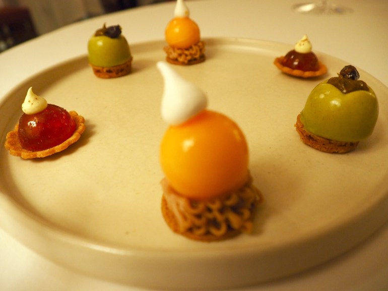 Les desserts sont un moment privilégié et tout le talent du pâtissier se concluent par une partition délicate et surtout pleine de fraîcheur. Je ne sais pas vous mais nous aimons les desserts rafraîchissants. Le pré dessert est une association de pommes et de sirop d’érable . J’aurais été curieux de faire un accord avec un cidre de glace Québécois de ma cave. Le citron est travaillé avec un granité au jasmin, et la rhubarbe nouvelle est partenaire d’épices qui s’associent fort bien avec l’acidité.