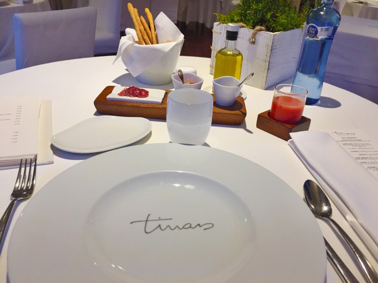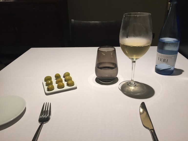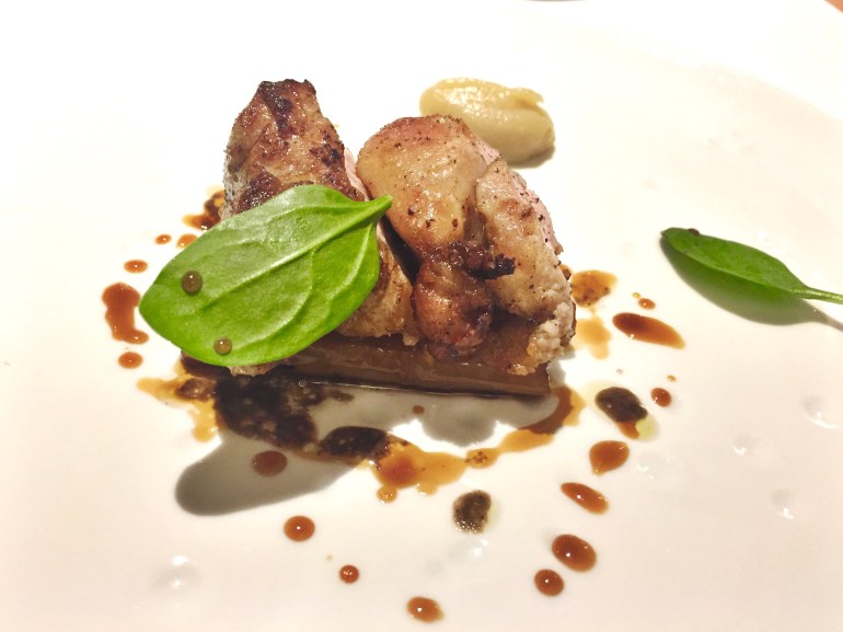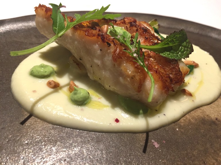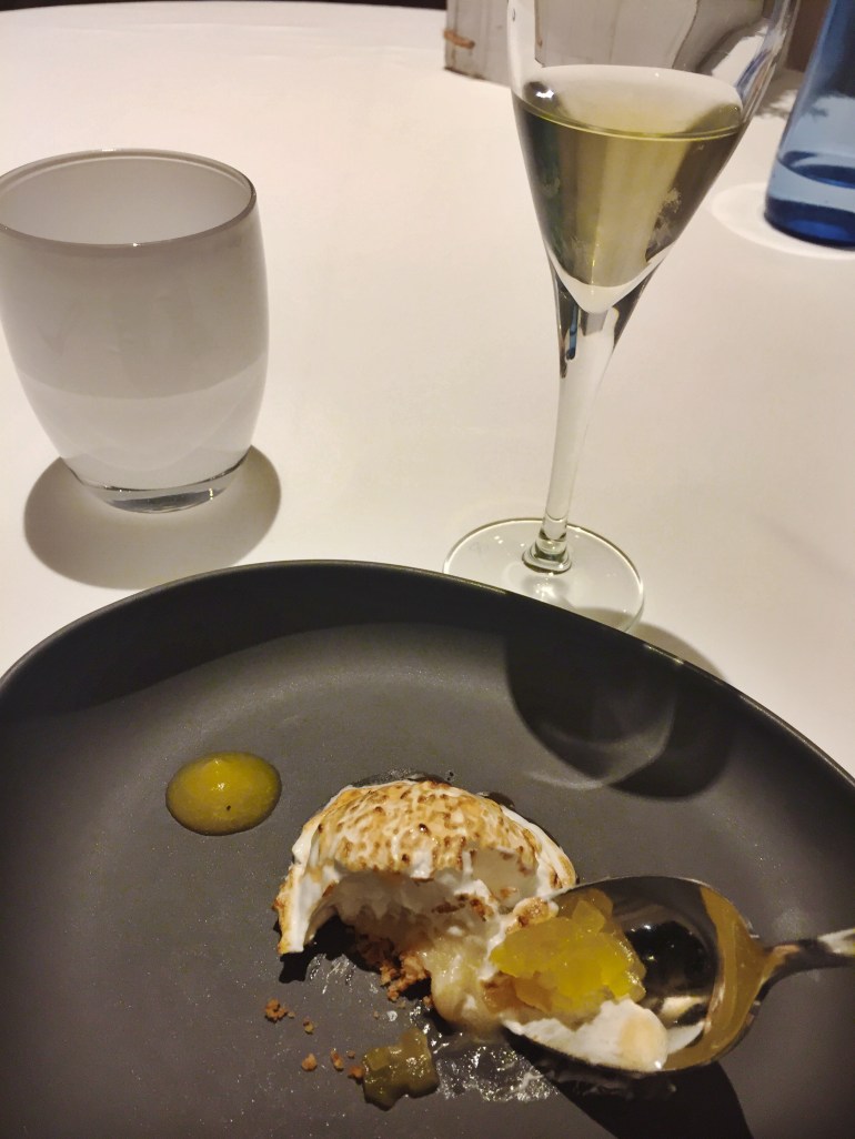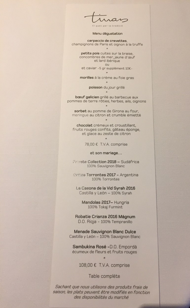 Nous avons juste remplacé le bœuf de Galice pour un riz de veau qui est un produit qui montre bien pour nous la créativité gustative d’un chef. Que des beaux produits et un service d’une belle gentillesse multilingue. Côté vin mention spéciale ce soir là au Sambukina Rosé local qui nous a enchanté. A noter que le prix des vins au verre commence à 3.90€ ce qui chez un étoilé est rarissime. Très belle carte des vins locale, d’Espagne, et du monde.
