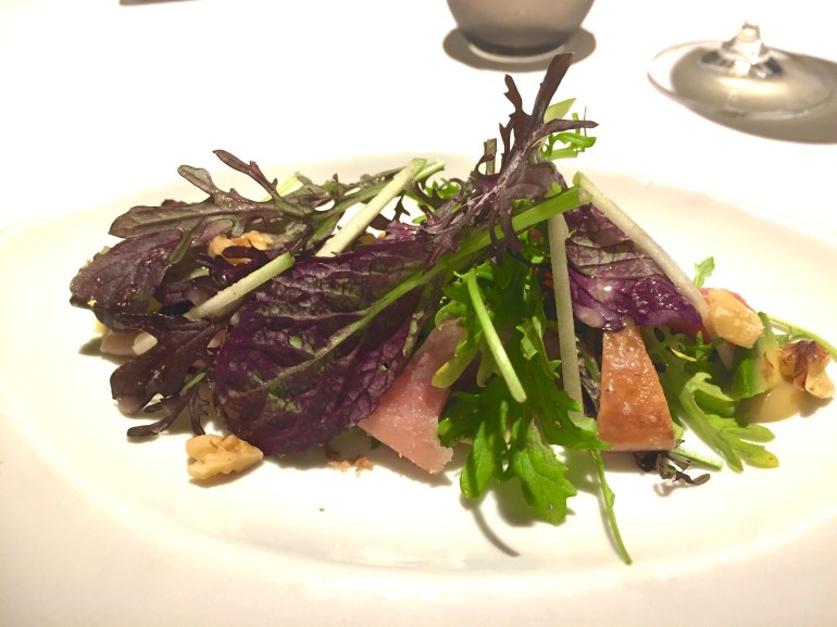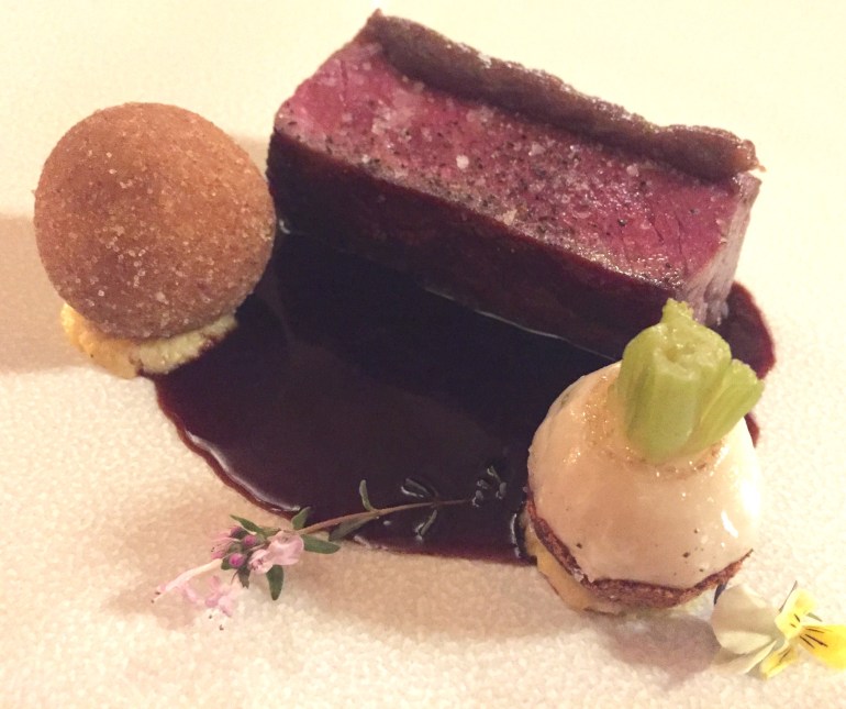 La suite du déjeuner c’est une déclinaison sur le thème de la St Jacques, de la Betterave, du Cabillaud, du Sous-bois et la fameuse truffe blanche, du Lièvre à la Royale…Sans oublier le plat signature « l’Insalata 21…51 » qui n’est pas sans rappeler le fameux Gargouillou du Suquet où Enrico a fait une saison. Tout est juste chez lui, la présentation, le goût, les cuissons. Du grand art Monsieur Crippa.